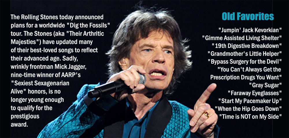 Rolling Stone is reporting that the Rolling Stones (aka “Their Arthritic Majesties”) have updated many of their best-loved songs to reflect their advanced age, including Jumpin’ Jack Kevorkian,” “Gimme Assisted Living Shelter” and “Bypass Surgery for the Devil.”